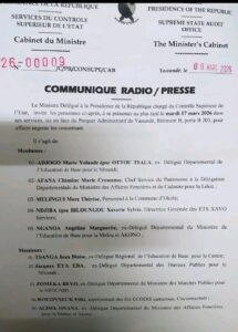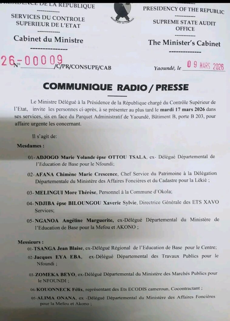 Madame le Ministre Délégué à la Présidence de la République chargé du Contrôle Supérieur de l’État , Mme Rose Fomudam, invite certains anciens fonctionnaires, fonctionnaires, hauts cadre d’entreprises privées à se présenter au plus tard le mardi 17 mars 2026 dans ses Services sis en face du Parquet au Centre Administratif de Yaoundé Bâtiment B porte B 203 , pour affaire urgente les concernant.
