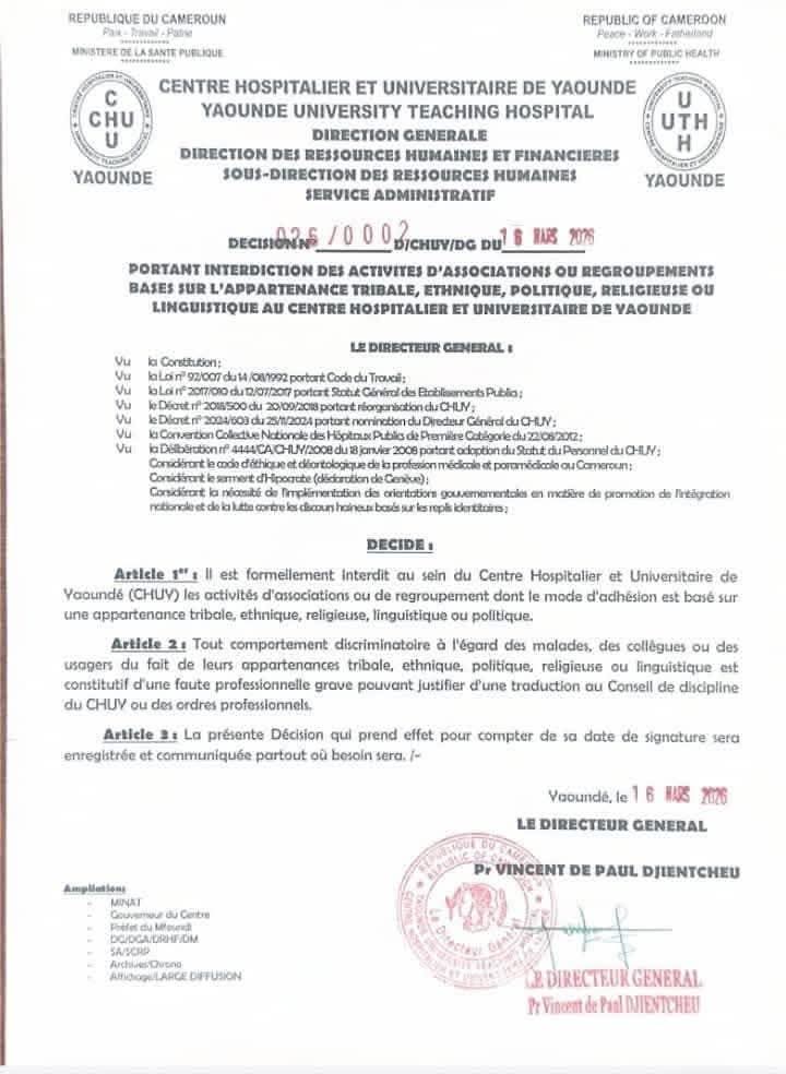 Il est interdit au sein du Centre Hospitalier et Universitaire de Yaoundé (CHUY) les activités d’associations ou de regroupements dont le mode d’adhésion est basé sur une appartenance tribale, ethnique, religieuse, linguistique ou politique.