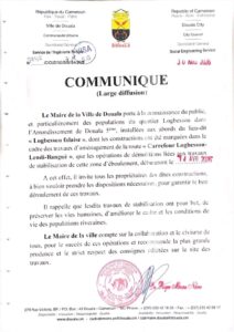 Le Maire de la ville de Douala , le Dr Roger Mbassa Ndine a dans un communiqué daté du 30 mars dernier, informé les populations riveraines du quartier Logbessou situés aux abords de la zone dite Logbessou falaise du démarrage imminent des travaux.